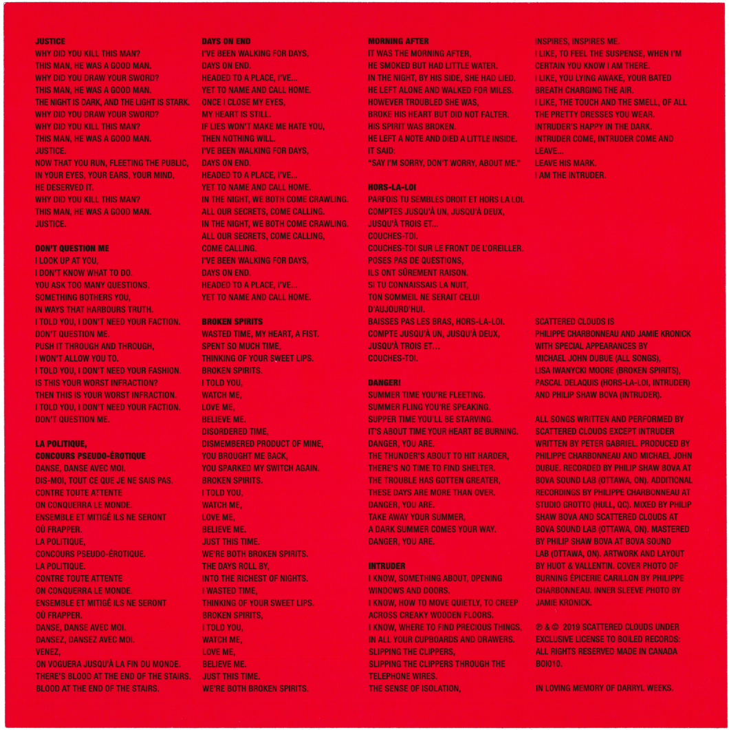 "Scattered Clouds is the sound of post apocalyptic romanticism. The Hull, Québec experimental band underscores auto-fictional narratives with brooding rhythm, cavernous vocals, and precise noise."